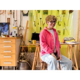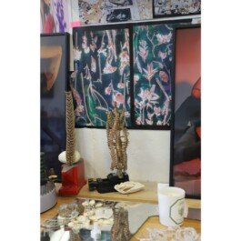 Météorite, galet, coquille d’oursin, poussière d’argent, fragment de mâchoire de croco, boussole, dinosaure fluo, miroirs de boule disco, plante médicinale séchée, cartes de tarot, chute de bronze, moule en plâtre, mues, phrases tirées des rêves … peuplent mon atelier.