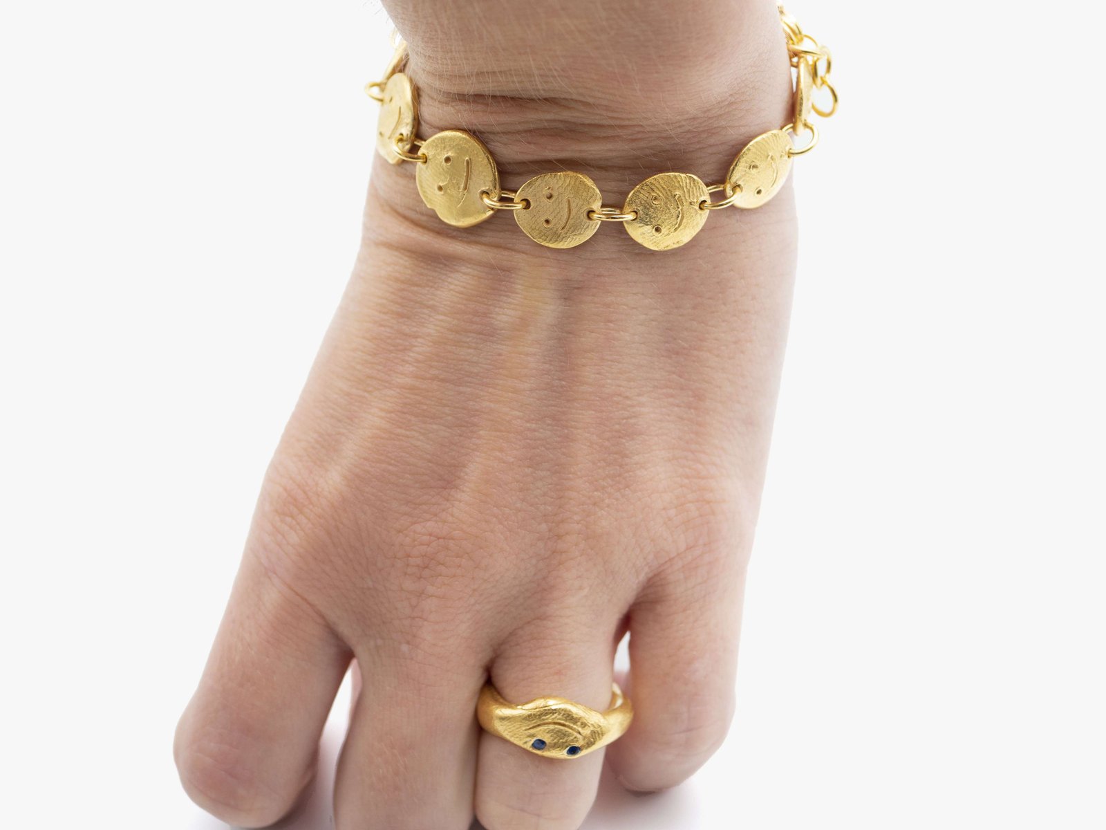 All the smiles are unique, hand carved by Chloe Valorso in beeswax making them all different and special. They are crooked, raw, textured with her fingerprints. They are all a bit fucked up, because life is messy, crazy, we get banged up and rise again. We smile with our teeth, we smile in disguise, we smile sad, happy, angry, stressed and all the emotions in between. This ring is to remind you it’s going to be OK. You can do it, you are your own smile.